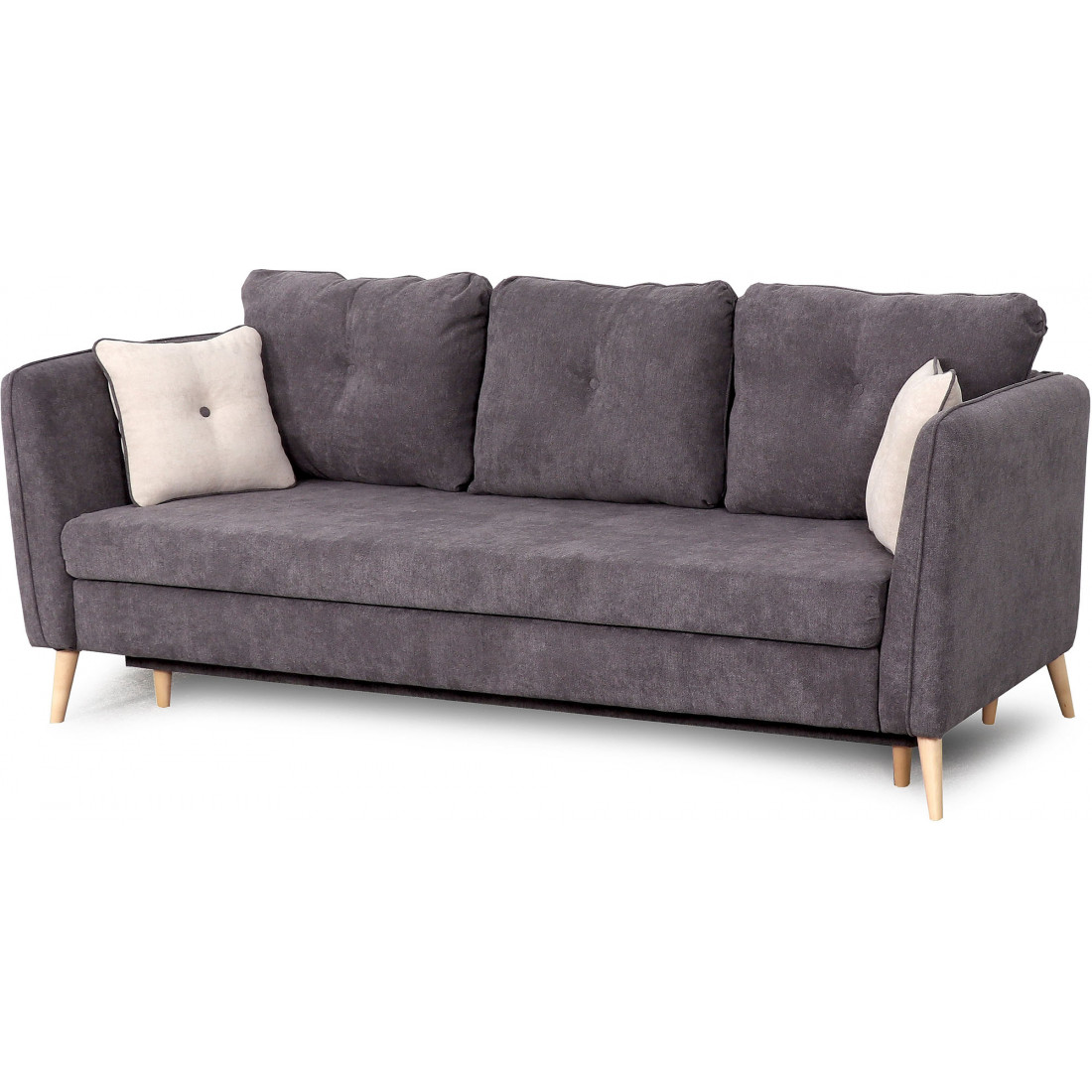 Диван украшают декоративная отстрочка, декоративные утяжки с пуговицами на подушках. Опоры дивана из массива березы подчеркивают стилистику.